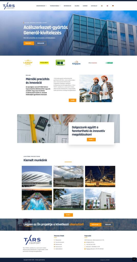 A TÁRS-95 Kft., Debrecen egyik vezető generálkivitelező és acélszerkezet-gyártó vállalkozása, régi, elavult weboldalának teljes megújításával keresett meg. A cég tevékenységei közé tartozik a generálkivitelezés, egyedi acélszerkezetek gyártása, valamint kereskedelmi és szolgáltató tevékenységek. Mivel a társaság nem magánszemélyeket, hanem cégeket céloz meg, a weboldal célja nem elsősorban az ügyfélszerzés volt, hanem a professzionális online jelenlét megteremtése és a tevékenységek bemutatása.